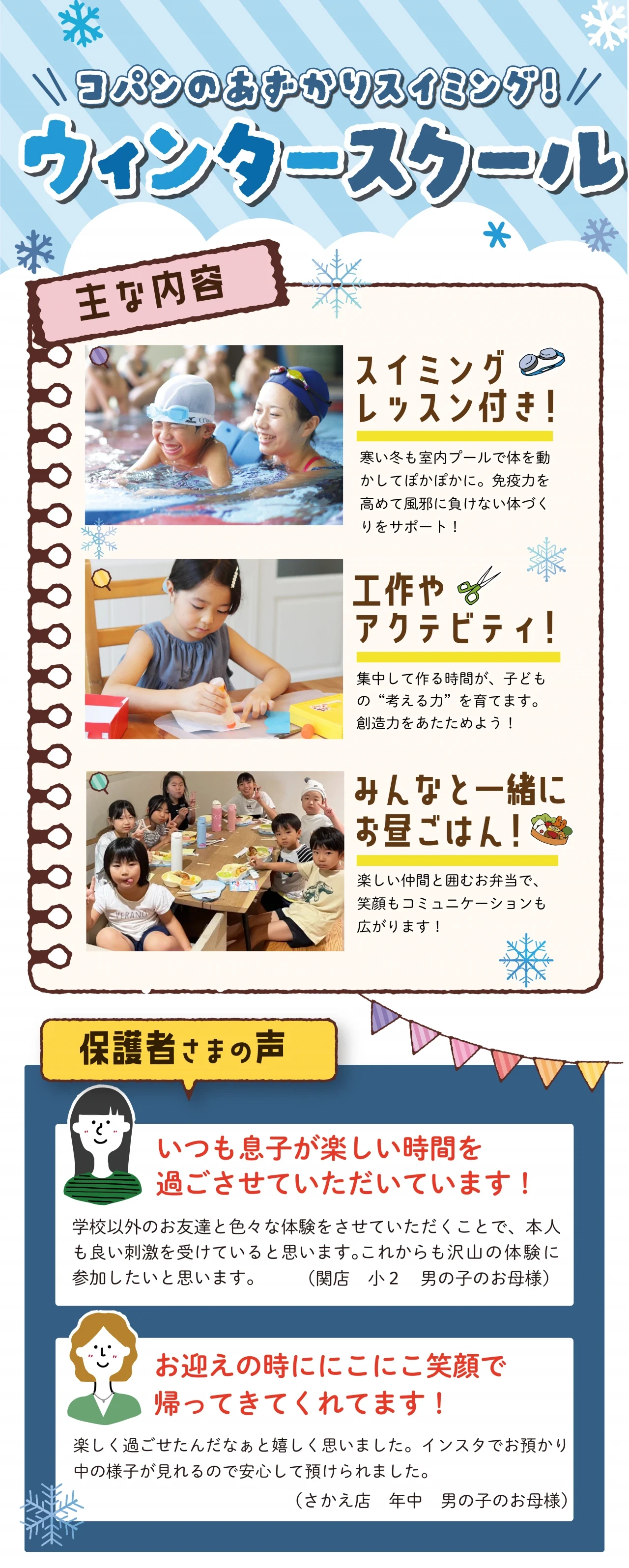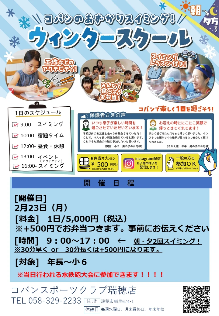 2月ウィンタースクールのご案内 2026.1.19 イベント・短期教室 コパンに通っていないお子様でもご参加いただけます!!是非、たくさんのお友達を誘ってご参加ください!! WEBでお申込み お申込みフォーム 電話で申し込み 058-329-2233