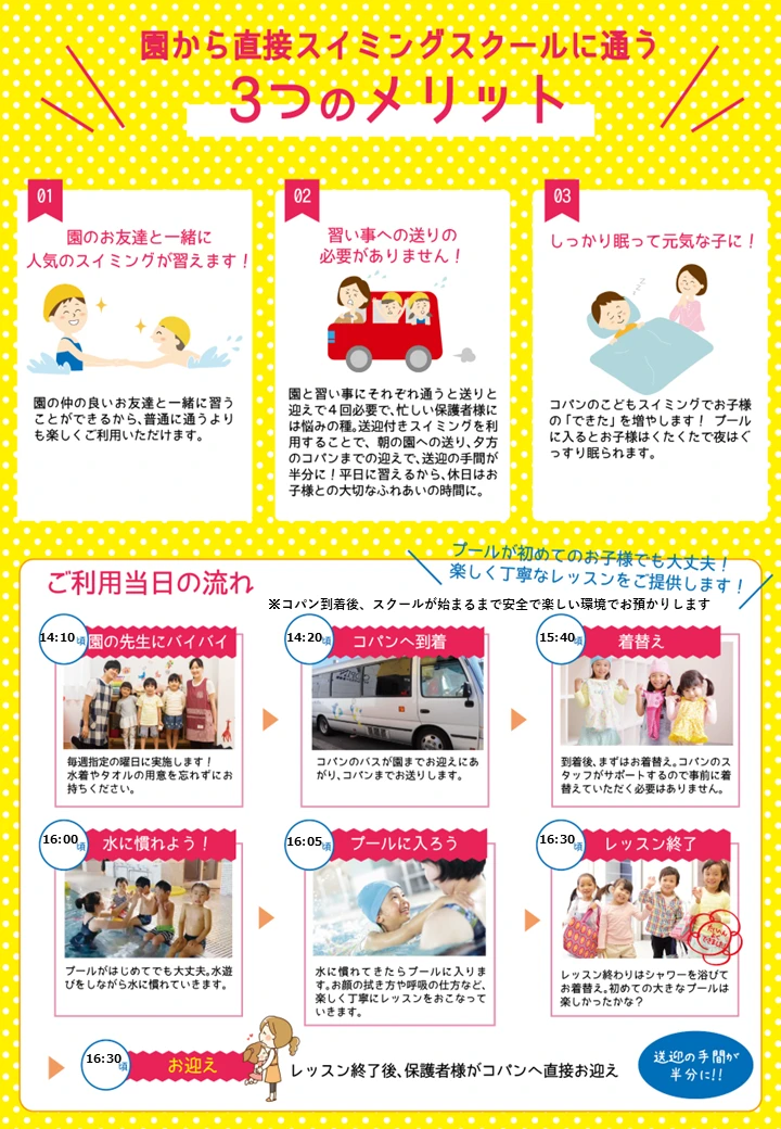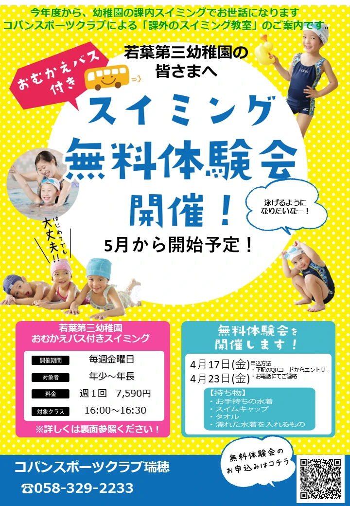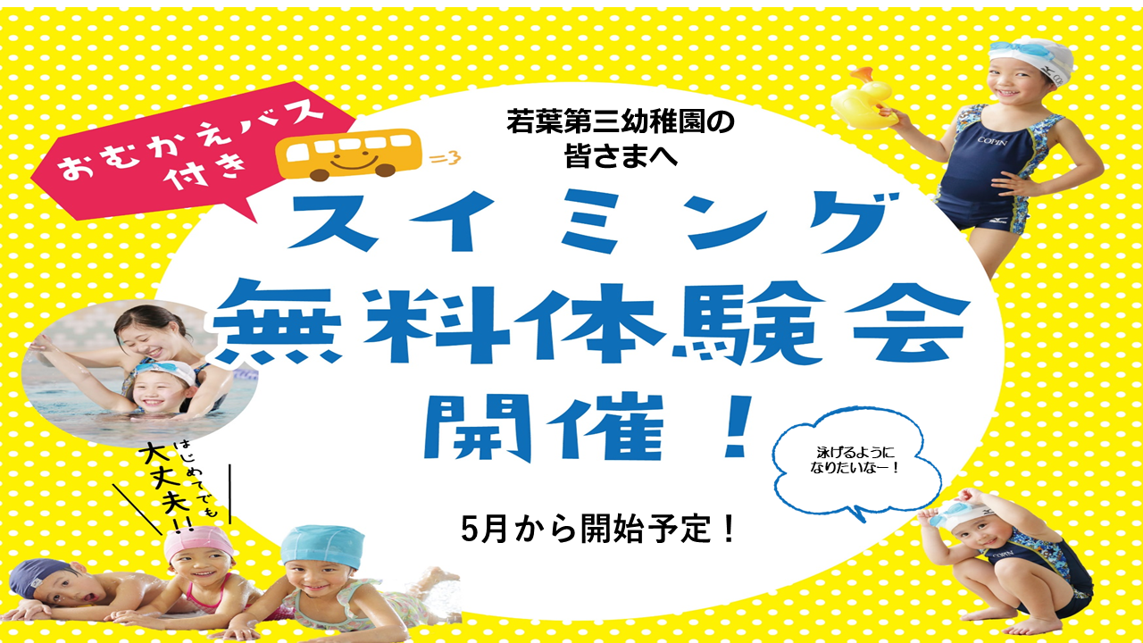 若葉第三幼稚園様 無料体験会のお知らせ 2026.3.25 イベント 開催 : 2026年4月17日(金) ~ 2026年4月24日(金) 若葉第三幼稚園様限定の体験会になります。 送りが不要でスイミングに通うことができるプランになります。 是非たくさんのお友達とご参加ください。 WEBでお申込み お申込みフォーム 電話で申し込み 058-329-2233 ※クラス分けはお子様の泳力などによって分けさせていただきます。また体験会がある前日までに事前連絡をさせていただきます。 WEBでお申込み お申込みフォーム 電話で申し込み 058-329-2233
