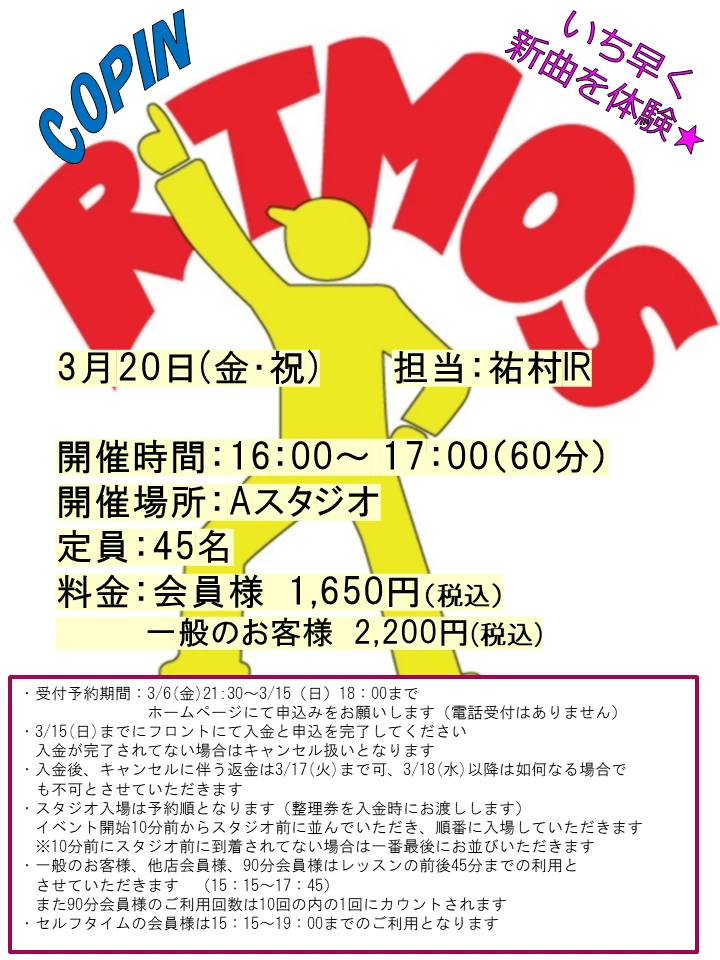 ・3/15(日)までにフロントにて入金と申込を完了してください