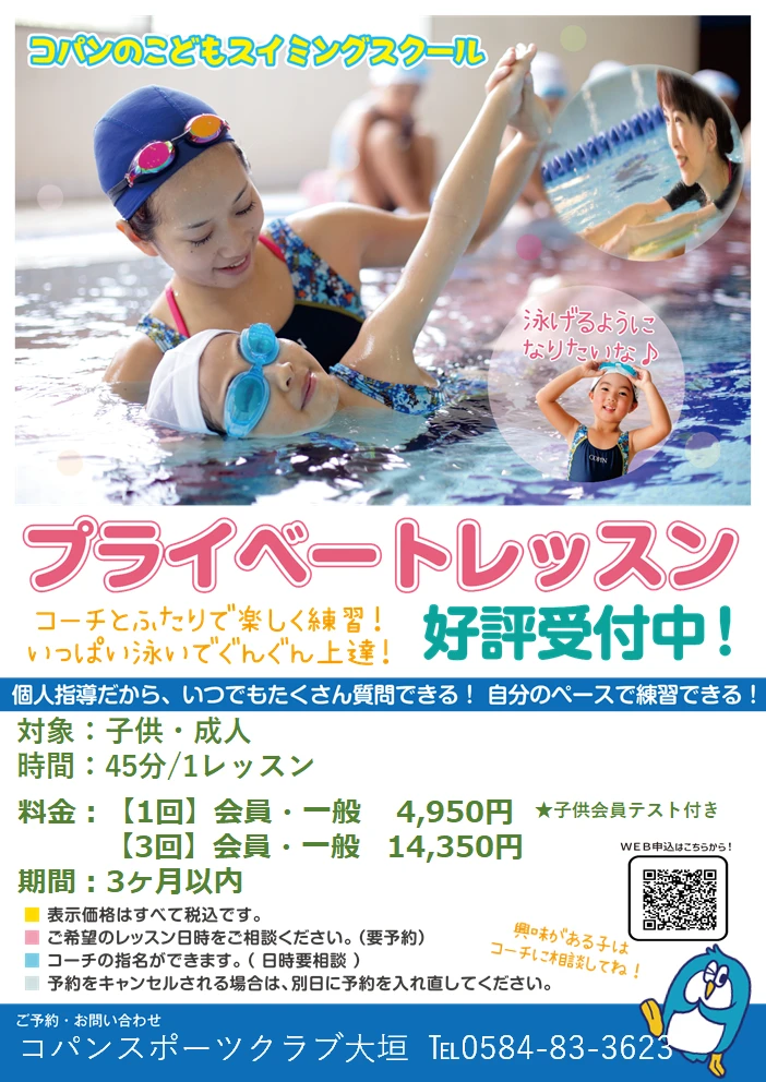 個別指導でスイミングを始めよう! 2023.9.22 イベント・短期教室 水が苦手、浮けない、泳げない… 水に触れあう機会が少ないだけかも知れません。 レッスンを通して水に慣れ、自分でクロールを泳げるようになることを 目標にして頑張りましょう! 直接お電話にてご連絡ください。 コーチと1対1で習うマンツーマンレッスンです。 なかなかスイミングスクールに通う時間がない、きっかけがないという方におすすめ! 友達と一緒にグループレッスンも可能です。 詳細 下記をご覧ください。 WEBでお申込み お申込みフォーム 電話で申し込み 0584-83-3623 WEBでお申込み お申込みフォーム 電話で申し込み 0584-83-3623