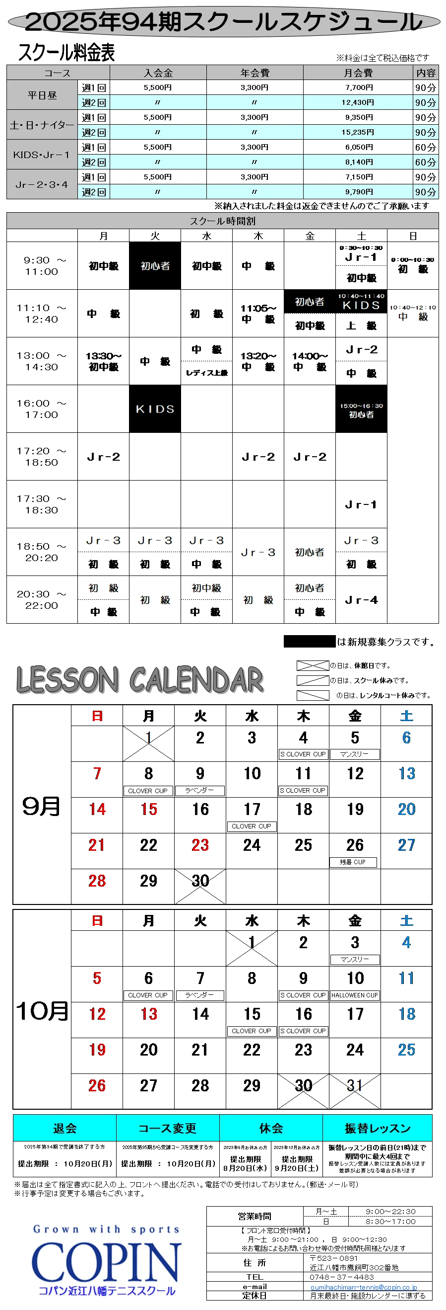 最近の記事 10/30(木)まで!秋の入会キャンペーン実施中! 2025.9.8 キャンペーン more 【大人テニススクール】どんなレッスンか体験してみよう!!(テニス経験者の方対象) 2025.9.2 イベント more 無料休会制度の延長について 2025.8.19 お知らせ more 無料休会制度の延長、及び一部変更について 2024.8.26 お知らせ more