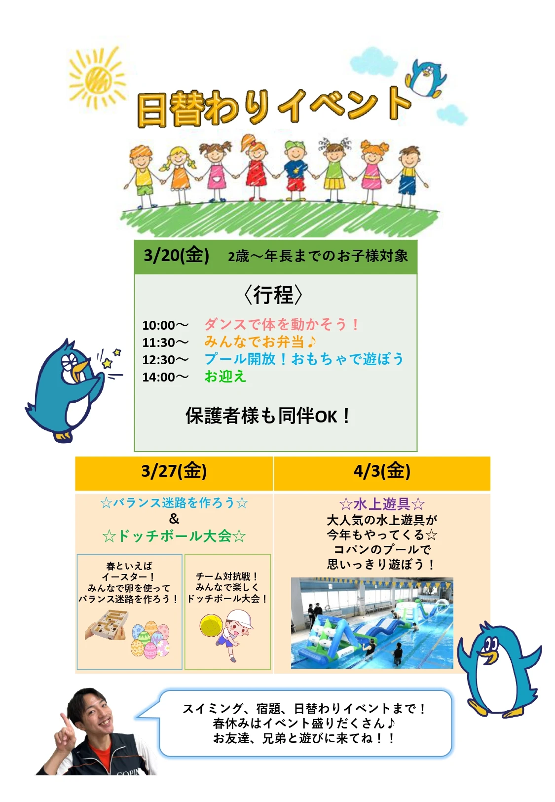 工作!スイミング上達!日替わりイベント!みんなで昼食(コパンが準備します)