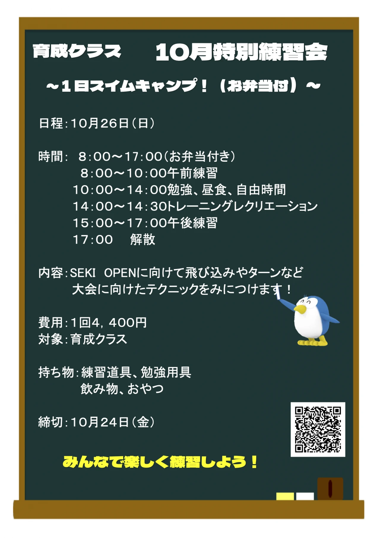 10月はスイムキャンプ(お弁当付き) 2025.10.7 イベント・短期教室 日時:10月26日(日)8:00~17:00 内容:8:00~10:00午前練習 14:00~14:30トレーニングレク 15:00~17:00午後練習 ※SEKI OPENに向けた練習会! 飛び込みやターン・速く泳ぐテクニックを身につけます! 費用:4400円(税込み)お弁当付き お申し込みは↓↓↓ WEBでお申込み お申込みフォーム 電話で申し込み 0575-22-3688