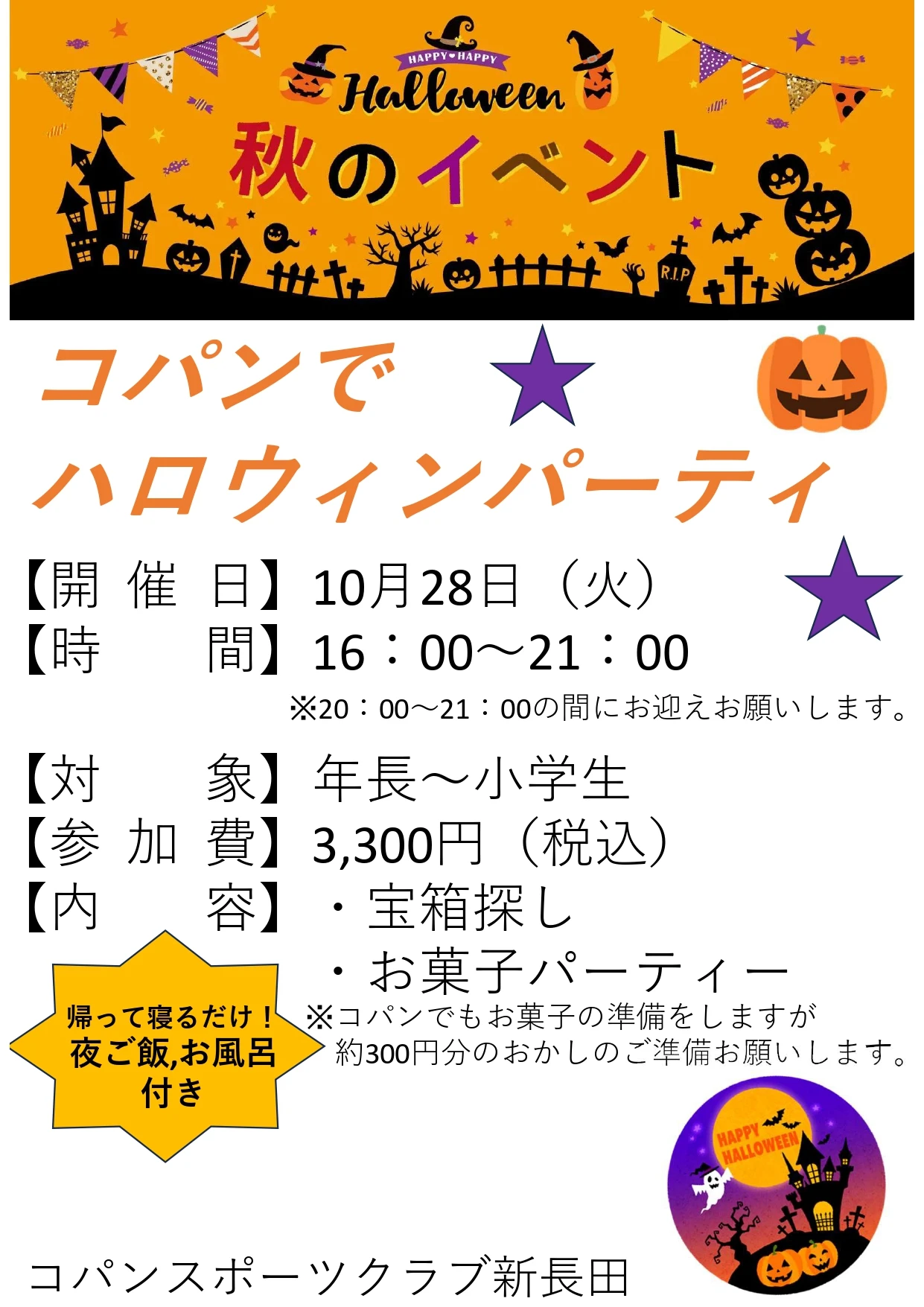 10月28日(火)コパンでハロウィンイベント! 2025.9.27 イベント・短期教室 コパンでハロウィンイベントを開催! コパンの中を探索し、お菓子の宝箱を見つけよう! 見つけたお菓子、コパンで用意したお菓子、持ってきたお菓子でお菓子パーティを開催! 保護者様に嬉しい夕飯&お風呂付き! お子様を預けてゆっくりしてください! お申し込みは下記のお申し込みフォームからお願いいたします。 WEBでお申込み お申込みフォーム 電話で申し込み 078-646-2222