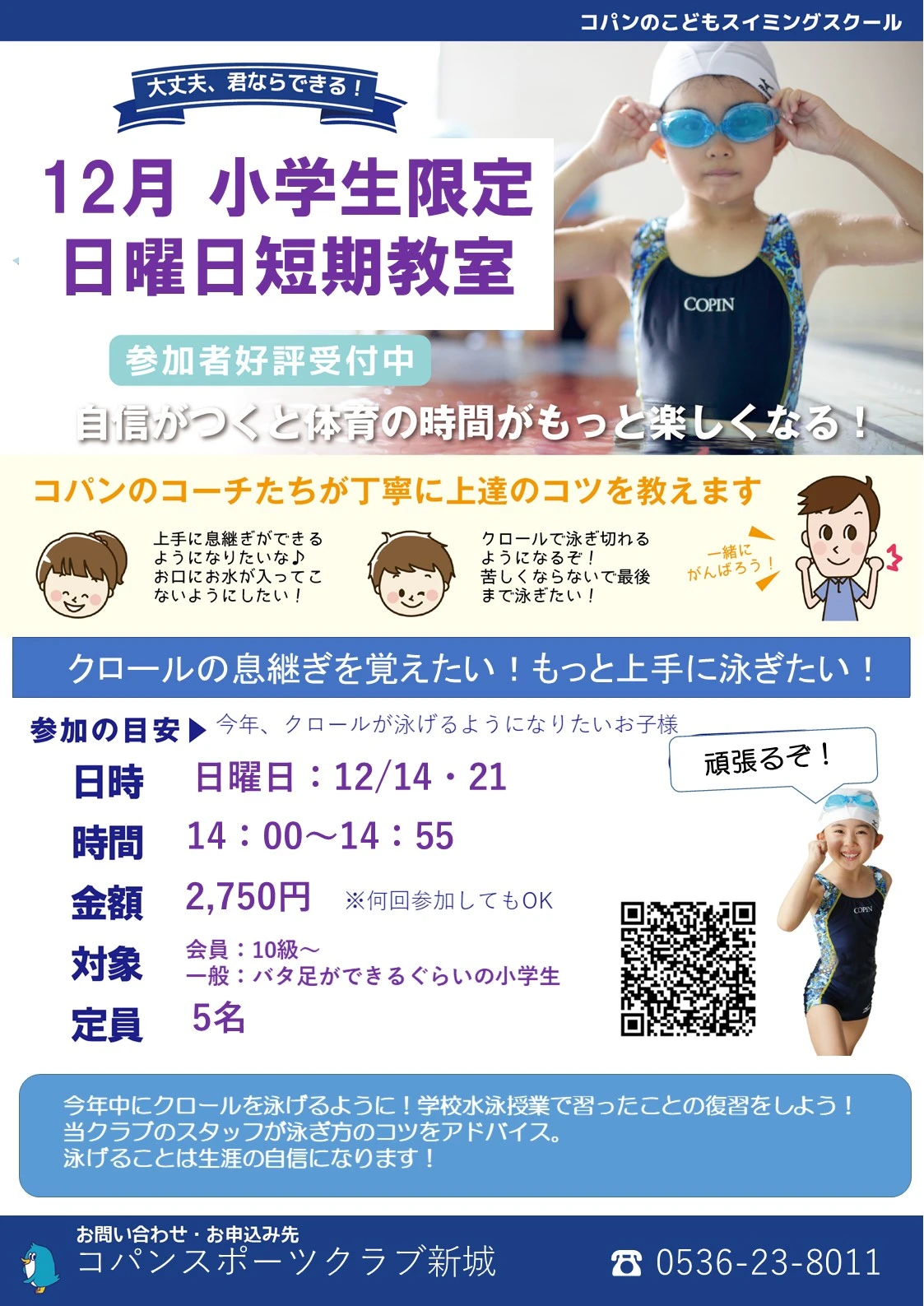 コパンで上達!12月 日曜日 初級クロール短期教室 2025.11.29 イベント・短期教室 日曜日の短期教室! ●小学生でクロールの練習をしたい方 ●小学生でプール初めてのお子様もOK ぜひご参加くださいね! WEBでお申込み お申込みフォーム 電話で申し込み 0536-23-8011 WEBでお申込み お申込みフォーム 電話で申し込み 0536-23-8011