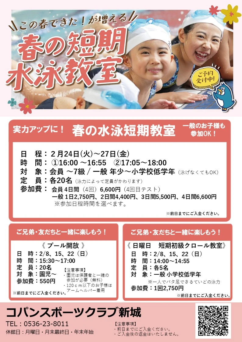 コパンで上達!2月 日曜日 初級クロール短期教室 2026.1.31 イベント・短期教室 日曜日の短期教室! ●小学生でクロールの練習をしたい方 ●小学生でプール初めてのお子様もOK ぜひご参加くださいね! WEBでお申込み お申込みフォーム 電話で申し込み 0536-23-8011 WEBでお申込み お申込みフォーム 電話で申し込み 0536-23-8011
