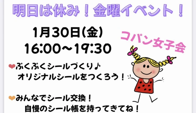 - イベント内容1月30日(金)16:00~19:30☆ぷくぷくシール作り♪ オリジナルシールをつくろう!☆みんなでシール交換! 自慢のシー…
