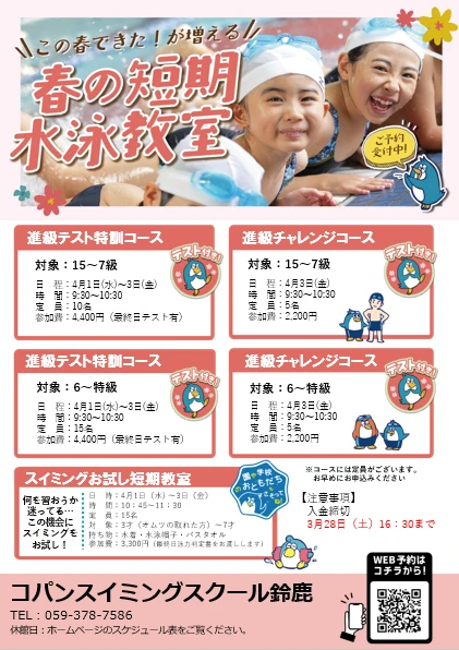 最近の記事 コパンスイミングスクール鈴鹿誕生1周年!!プール開放!! 2026.3.30 イベント・短期教室 more 日曜日コースご入会募集中!! 2026.3.27 お知らせ more スイミング無料体験会開催中!! 2026.3.27 イベント more 【期間限定4/29(水)まで】スイミング入会キャンペーン! 2026.3.26 キャンペーン more