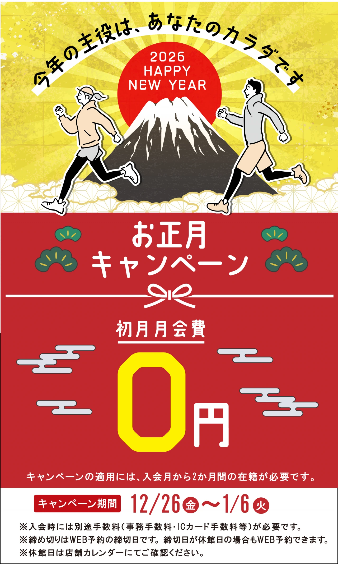 1/6(水)まで!年末年始入会キャンペーン実施中! 2025.12.8 キャンペーン 年末年始入会キャンペーン開催中♪ 2026年の主役はあなたのカラダです! 新しい年、新しい自分に!! WEBでお申込み お申込みフォーム 電話で申し込み 052-602-6226 WEBでお申込み お申込みフォーム 電話で申し込み 052-602-6226