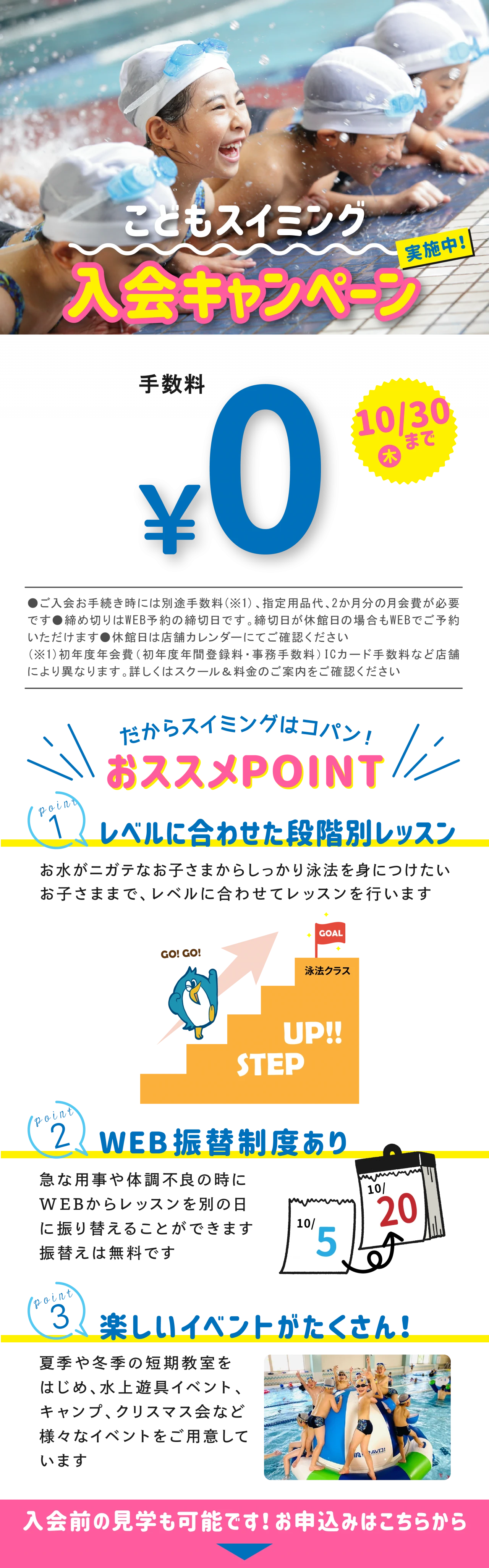秋のスイミング♪わくわく入会キャンペーン! 2025.9.8 キャンペーン お子様の成長は早いから、思い立った時が始めどき♪ 4万人のお子様が通うスイミングスクール★ はじめてのお子様もご安心ください♪ WEBでお申込み お申込みフォーム 電話で申し込み 052-602-6226 WEBでお申込み お申込みフォーム 電話で申し込み 052-602-6226