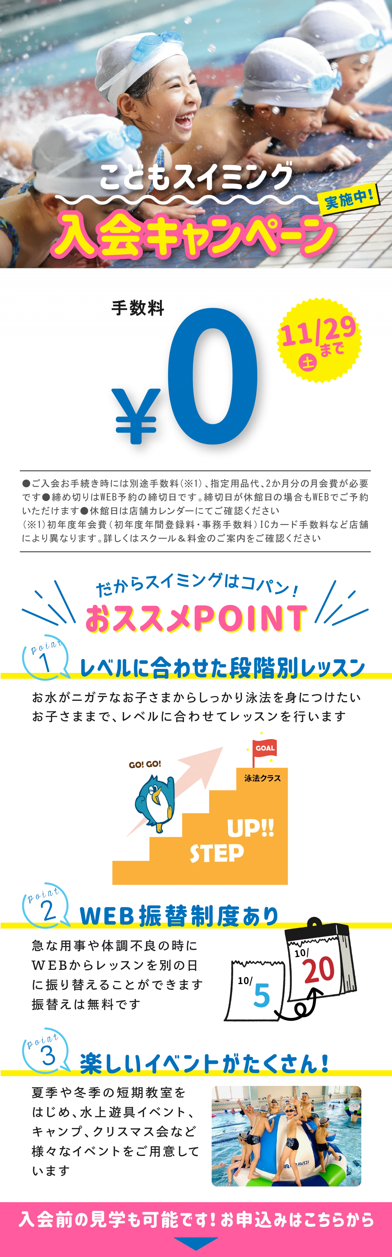 秋のスイミング♪わくわく入会キャンペーン! 2025.9.9 キャンペーン お子様の成長は早いから、思い立った時が始めどき♪ 4万人のお子様が通うスイミングスクール★ はじめてのお子様もご安心ください♪ WEBでお申込み お申込みフォーム 電話で申し込み 052-602-6226 WEBでお申込み お申込みフォーム 電話で申し込み 052-602-6226