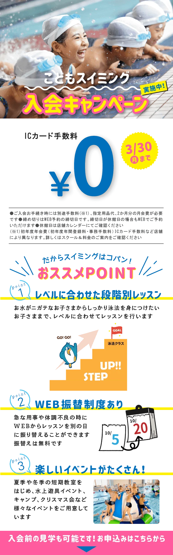 春のスイミング♪わくわく入会キャンペーン! 2026.2.3 キャンペーン お子様の成長は早いから、思い立った時が始めどき♪ 4万人のお子様が通うスイミングスクール★ 温水プールで楽しく泳ごう! はじめてのお子様もご安心ください♪ WEBでお申込み お申込みフォーム 電話で申し込み 052-602-6226 WEBでお申込み お申込みフォーム 電話で申し込み 052-602-6226