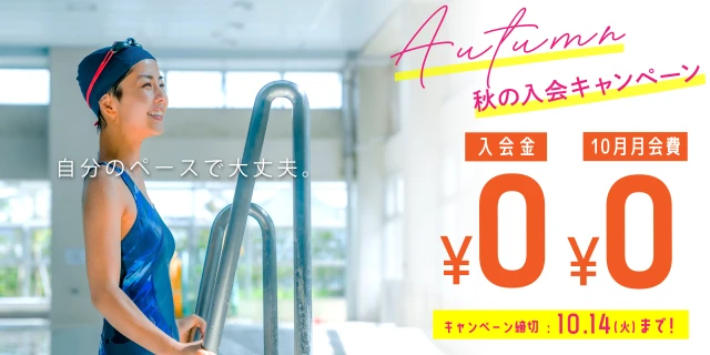 はじめるなら今がチャンス!水の中で効率よく運動♪ 10月のキャンペーン内容 入会金 → 0円10月度月会費 → 0円※ご入会お手続き時に別途事務手数料が必要です(鳴海店除く)※キャンペーン適用には入会月から2ヵ月間の在籍が必要です※締切はWEB予約の締切日です。締切日が休館日の場合もWEBでご予約いただけます※休館日は店舗カレンダーでご確認ください