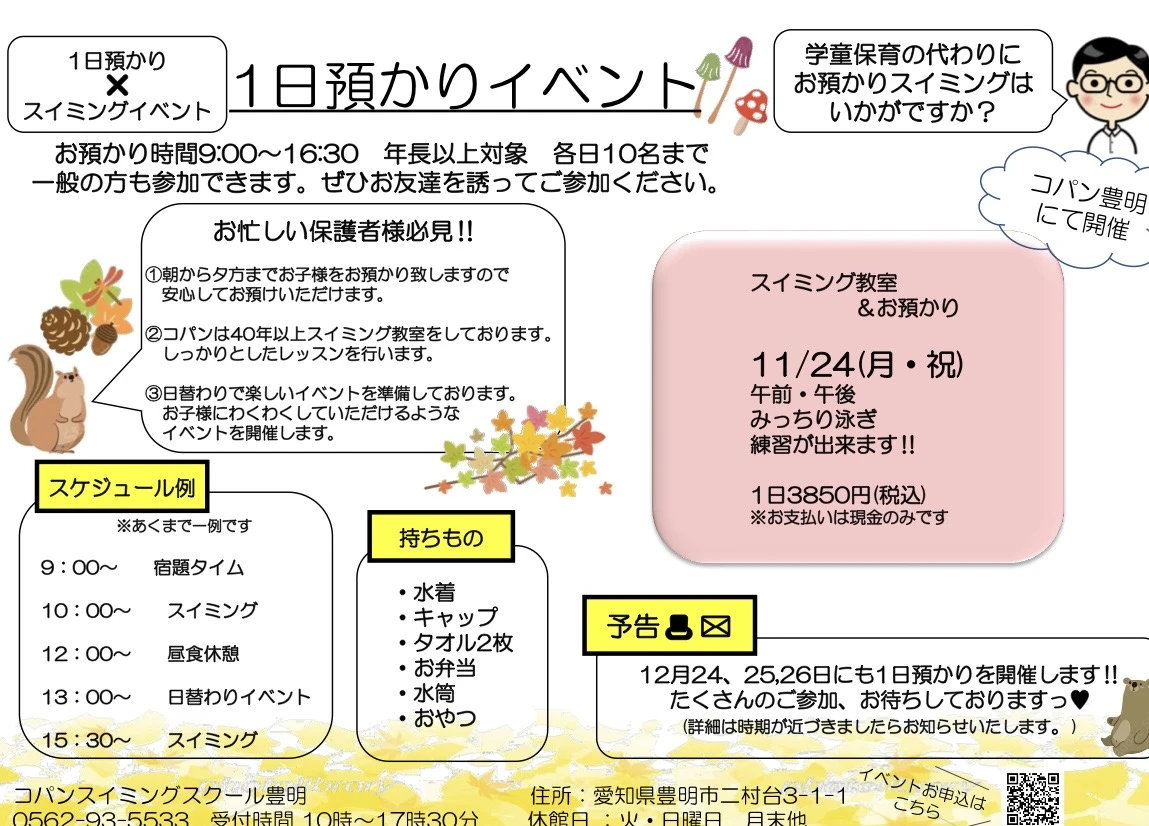 【11月】一日預かりイベント 2025.11.10 イベント・短期教室 朝の9時から夕方16時半までお子様をお預かりします。 プールレッスンに宿題タイム、日替わりのイベントを用意して楽しく過ごせる時間を提供します。 WEBでお申込み お申込みフォーム 電話で申し込み 0562-93-5533