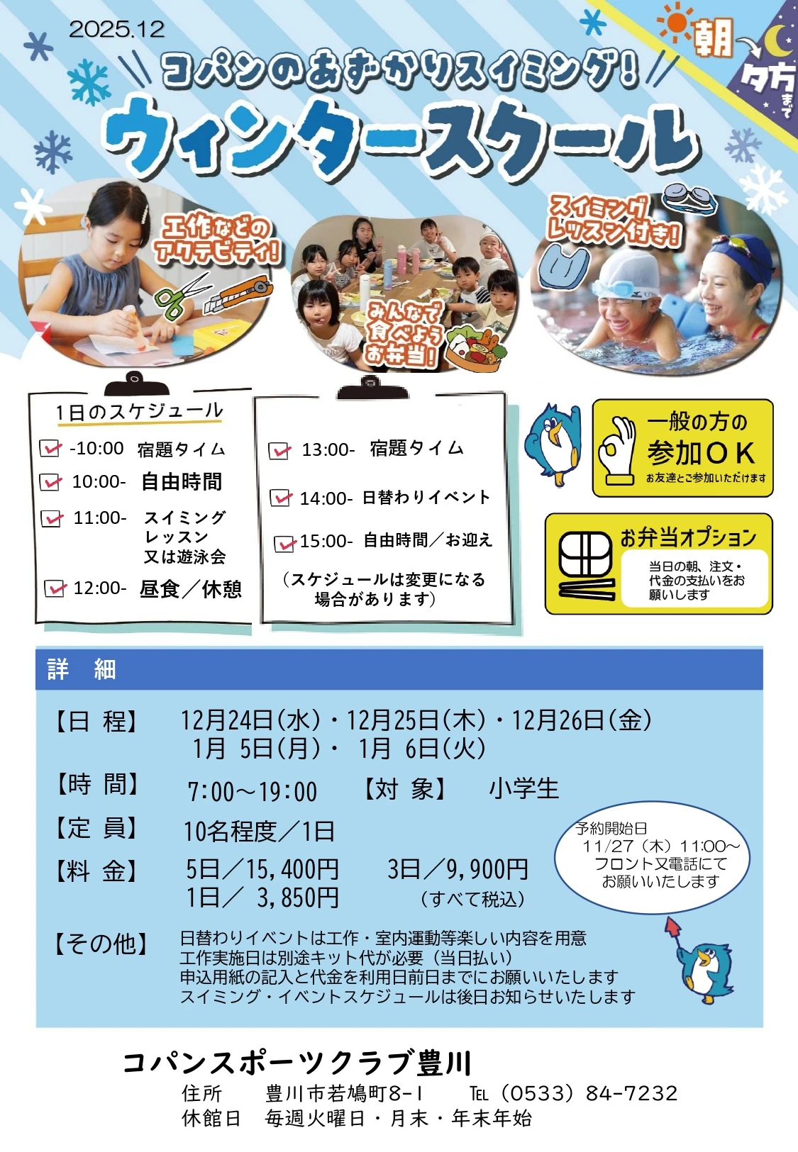 冬休み満喫 ウィンタースクール(スイミングレッスン又はプール遊泳付き!) 2025.11.19 イベント・短期教室 日替わりイベントとスイミングレッスン、プール遊泳が楽しめる冬休み1日イベント!宿題タイム・お弁当タイムもあり! 朝から夕方まで冬休みを満喫できます!会員以外の方も参加OK! お友達を誘って遊びに来てね! 日程 12/24(水)~26(金)・1/5(月)・6(火) 全5回 時間 7:00~19:00まで 対象 小学1年生~6年生まで 料金 1回 3,850円(税込) 3回 9,900円(税込) 5回 15,400円(税込) ※工作イベント日は別途工作キット代金が必要です 定員 日毎異なります。 先着順にお取りします。定員の場合はフロントまでご確認ください その他 ◎ご予約はお電話またはフロントにて、預ける日、時間をお申込みください ※前日までにフロントにて申込(入金)が必要です ※日毎定員がありますので、ご希望に添えない場合もあります ・希望者はお弁当(有料)もご用意いたします ・日替わりイベントはフロントにてご確認ください※イベントは変更になる場合もあります 一度お支払いされた料金は、返金致しかねますのでご了承ください ※ 11/27(木)11:00~電話または当クラブフロントにてご予約をお願いいたします 満員御礼 別日程につきましては、店舗までお問い合わせください