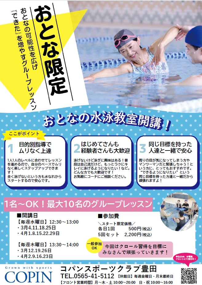 コパン豊田初のおとなの水泳教室!はじめてさんも経験者さんも大歓迎!
