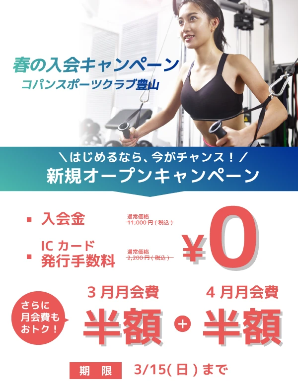 ※お手続き時には、事務手数料と2ヶ月分の月会費が必要です※キャンペーン適用には、2ヶ月間の継続条件がございます※締め切りはWEB予約の締切日です。締切日が休館日の日もWEB予約できます※休館日は店舗カレンダーにてご確認ください