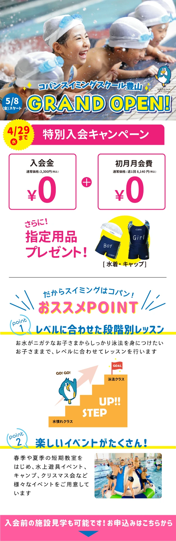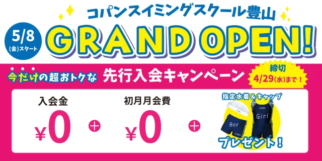 コパンスイミングスクールは4万人のお子様が通うスイミングスクール★ 楽しく泳ぎを学ぼう!ほめて伸ばす指導でお子様の自己肯定感を育みます。 ※2026年5月入会の方が対象のキャンペーンです※ご入会お手続き時には別途手数料(2か月分の月会費・年会費・指定教材費)が必要です2026年5月8日(金)オープン!【WEB予約後、店舗で本手続きが必要です】