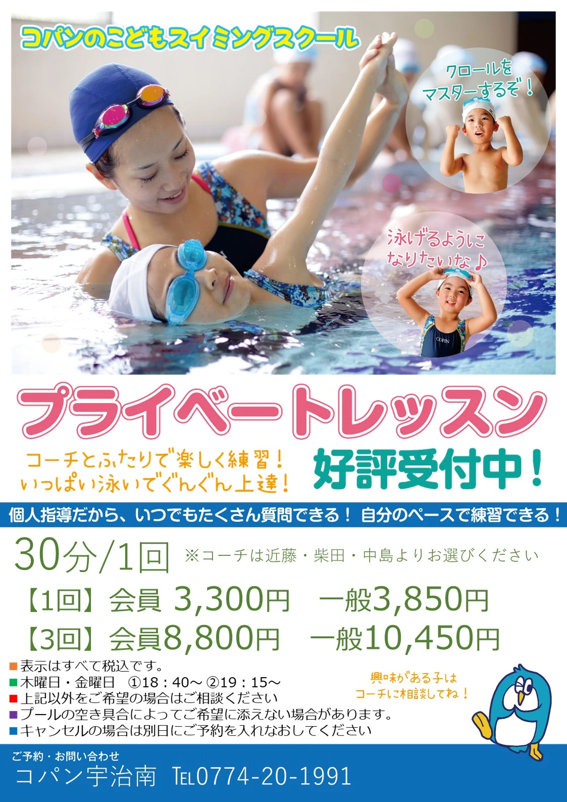 秘密特訓♪「プライベートレッスン」のお知らせ 2025.2.14 イベント・短期教室 コーチと2人だから苦手なことも相談してね♪ コーチと一緒に秘密特訓してみよう! 開催日 プライベートレッスン 時間 要相談 対象 どなたでも 定員 5名 料金 会員:3300/30分(税込) 一般:3,850/30分(税込) WEBでお申込み お申込みフォーム 電話で申し込み 0774-20-1991 ※予約時に必ずご希望の曜日時間帯をお伝えください※プールクラス事情によりご期待に添えることができかねる場合がございます WEBでお申込み お申込みフォーム 電話で申し込み 0774-20-1991