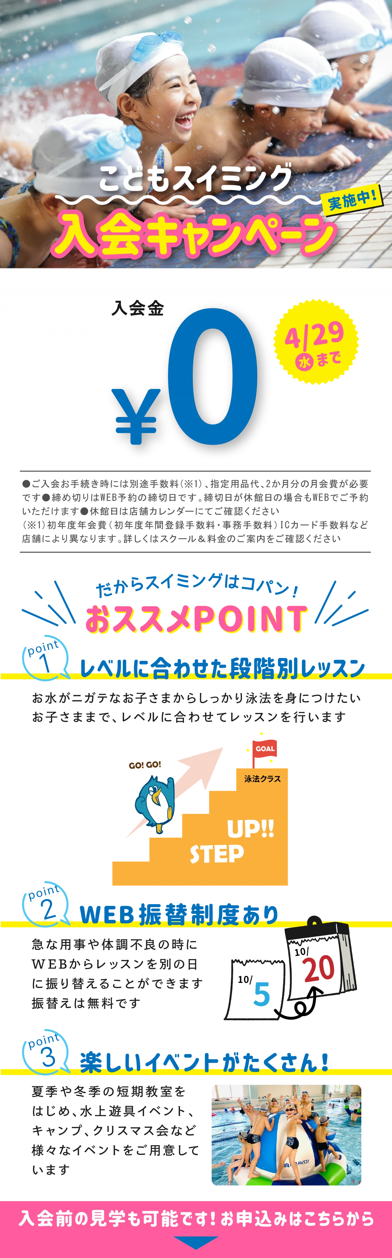 【期間限定4/29(水)まで】スイミング入会キャンペーン! 2026.3.26 キャンペーン ☺入会金3,300円→0円に! 体験レッスン・見学も受付中です♪春から初めて夏までにレベルアップ!コーチ一同お待ちしています♪ WEBでお申込み お申込みフォーム 電話で申し込み 0774-20-1991 WEBでお申込み お申込みフォーム 電話で申し込み 0774-20-1991