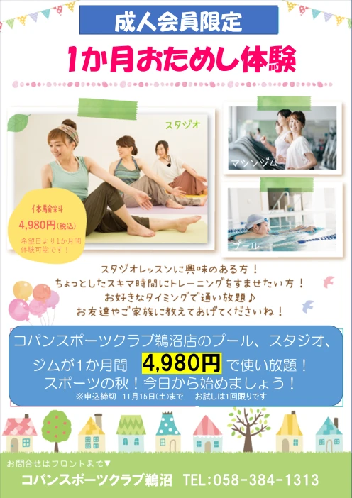 スポーツの秋 コパンに行ってみよう! 2025.10.18 イベント スポーツクラブってどんなとこ? コパン鵜沼が1か月利用できます。 申込締切: 11月15日(土)まで 開催 : 2025年11月15日(土) ~ 2025年11月15日(土) WEBでお申込み お申込みフォーム 電話で申し込み 058-384-1313 コパンスポーツクラブってどんなトコ?スポーツの秋😊 今ならおためし体験ができます!体験料金:4,980円お申込日から1か月間有効です WEBでお申込み お申込みフォーム 電話で申し込み 058-384-1313 カレンダーを見る イベント一覧を見る
