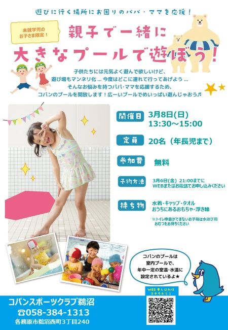 プール親子開放デー(未就学児対象) 2026.1.21 イベント・短期教室 プールの季節がやってきた! パパママと一緒にプールで遊ぼう! WEBでお申込み お申込みフォーム 電話で申し込み 058-384-1313 日時: 3/8(日) 13:30~15:00 定員: 20名 参加費: 無料 持ち物: 水着・キャップ・タオル ※保護者の同伴が必要です。↓↓↓ 下記の【お申込みフォーム】からご予約下さい WEBでお申込み お申込みフォーム 電話で申し込み 058-384-1313